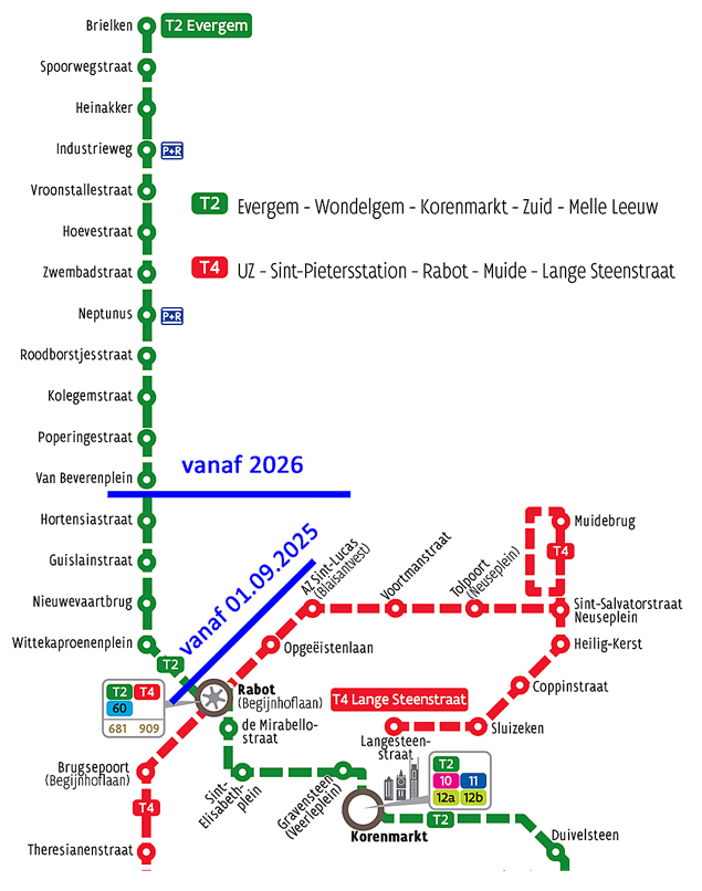 - In september 2025 starten de spoorwerken in de Gebroeders De Smetstraat en de Guislainstraat. Tram T2 zal dan vanaf 1 september tot eind 2025 niet tussen Gent Rabot en Wondelgem/Evergem rijden. De eindhalte is dan Gent Rabot.