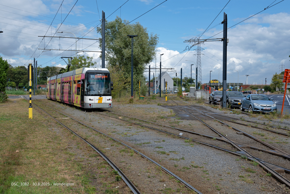 De halte Wondelgem-Industrieweg. Links tram 6310 op weg naar Evergem-Brielken, en in het midden de plaats waar trams die niet doorrijden naar Evergem tijdelijk worden opgesteld.