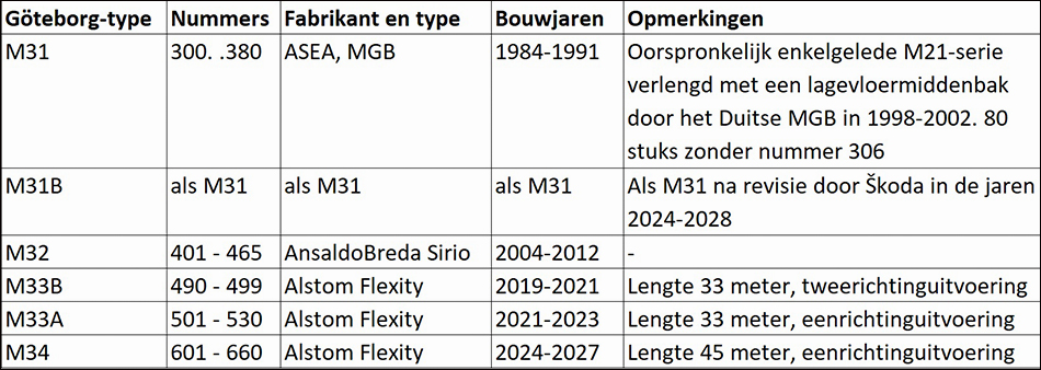 Onderstaande tabel geeft een overzicht van de huidige lagevloertrams, met daarbij de aantekening dat de oplevering van de typen M31B en M34 nog gaande is.