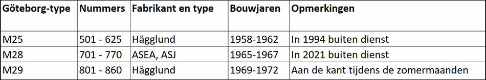De laatste drie grote vierasser-series in Göteborg zijn de in Zweden gebouwde M25, M28 en M29. Details staan in de volgende tabel.
