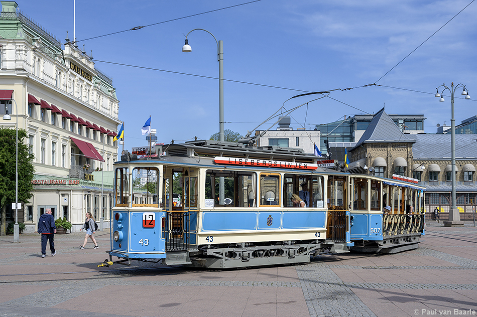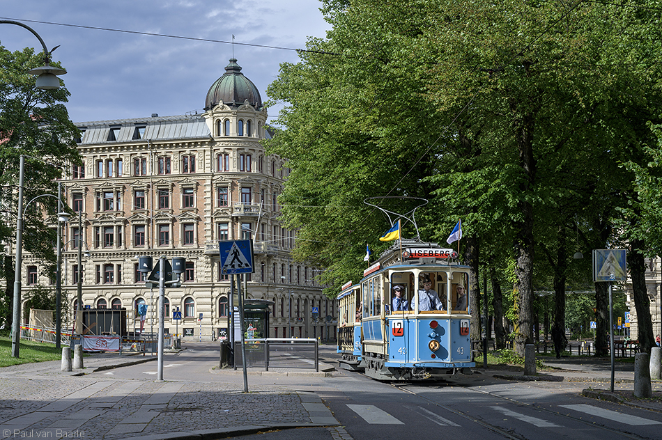 Motorrijtuig 43 werd in 1902 door ASEA gebouwd met open balkons. In 1915 werden de balkons gesloten en kreeg de tram de type-aanduiding M4. Motorrijtuig 43, samen met het open aanhangrijtuig 507 uit 1906, passeert hier de halte Vasaplatsen in een bijpassende, statige omgeving.