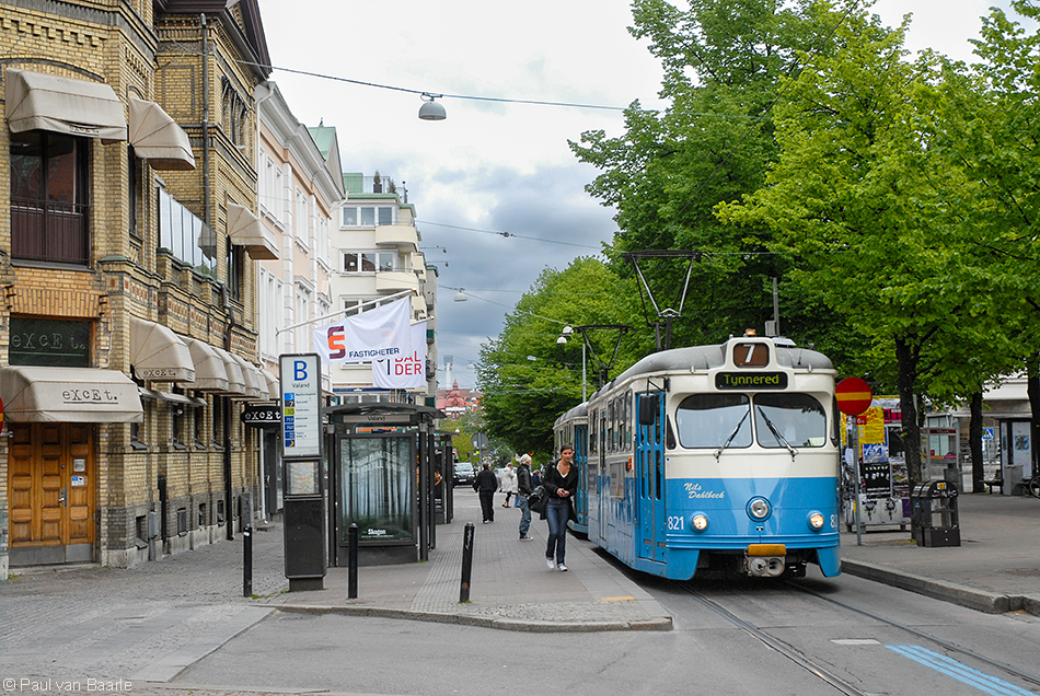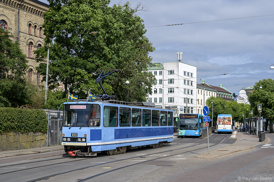 Een exoot in de museumtramcollectie van Göteborg is dit T7B5-motorrijtuig 100, gebouwd door het Praagse ČKD Tatra in 1989 voor Oslo. In Oslo heeft dit prototype proefgereden, maar tot een verdere bestelling is het daar niet gekomen. In Göteborg is de 100 te huur als partytram. De tram werd tijdens een extra rit gespot bij de halte Grönsakstorget.