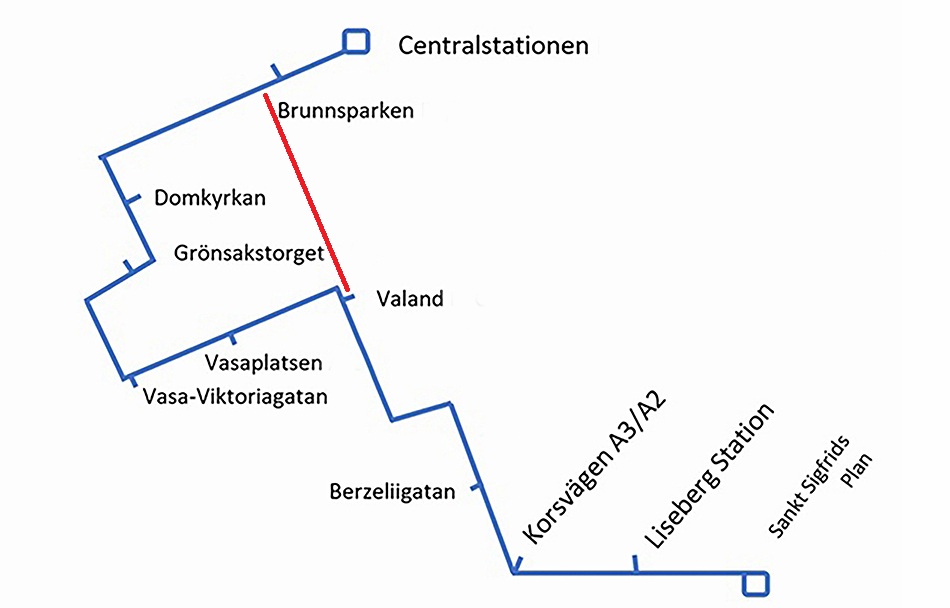 Vanwege werkzaamheden tussen 28 juni en 12 juli 2025 volgde de Lisebergslinjen een andere route dan normaal. In plaats van rechtstreeks van Brunnsparken naar Valand, reden de museumtrams om langs onder andere de haltes Domkyrkan en Vasaplatsen. Bron: Spårvägssällskapet RINGLINIEN (bewerkt).