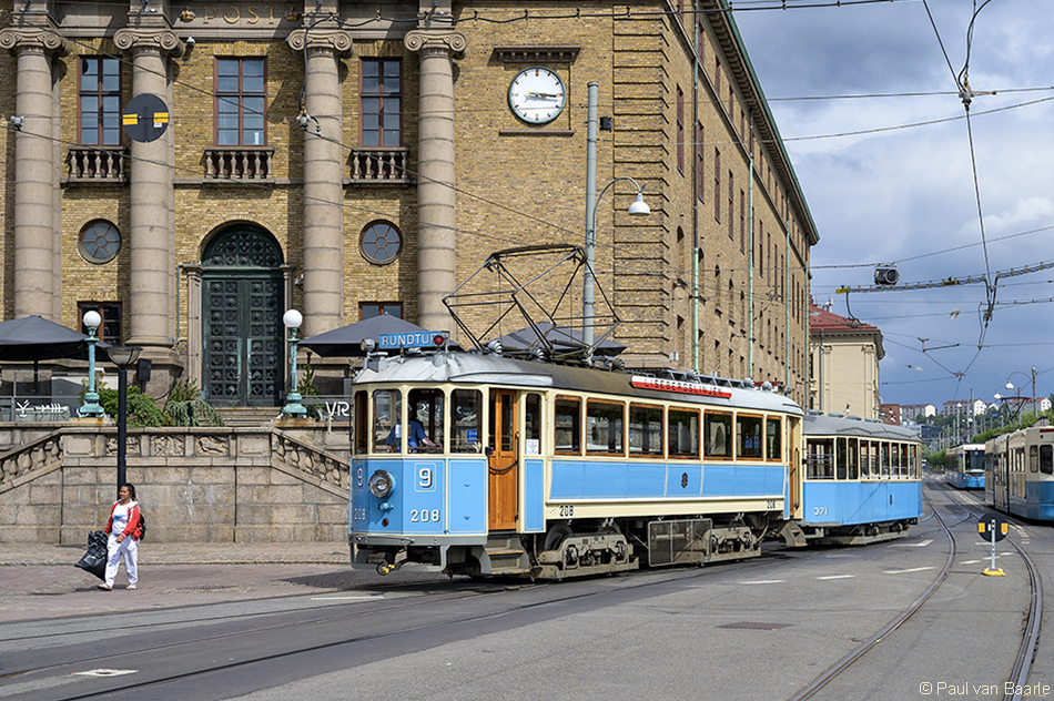 En over lange, grote trams gesproken: wat dacht je van deze interlokale motorwagen 208 uit 1928 van de Långedragslinjen? Deze interlokale tramlijn 9 liep van Järntorget via Långedrag naar Saltholmen, het huidige eindpunt van lijn 11. Vanwege de grote capaciteit wordt de museumwagen veelal ingezet voor groepsvervoer. Voor dat doel arriveert dan ook de 208 met aanhangrijtuig 371 op Drottningtorget. Van de Långedragslinjen is ook motorrijtuig 302 uit 1923 bewaard gebleven, maar deze is korter dan de 208.