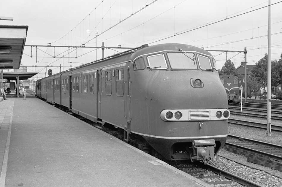 Roermond, 25 juli 1968. Treinstel 139 staat op het punt te vertrekken naar Venlo en Nijmegen. Het is nog betrekkelijk nieuw: de 42 dieselelektrische treinstellen Plan U werden tussen 1960 en 1963 gebouwd door Werkspoor. De treinstellen waren bij aflevering rood, vandaar hun bijnaam Rode Duivel. Maar ze ontkwamen niet aan de gele huisstijl die NS inmiddels op het programma had staan.