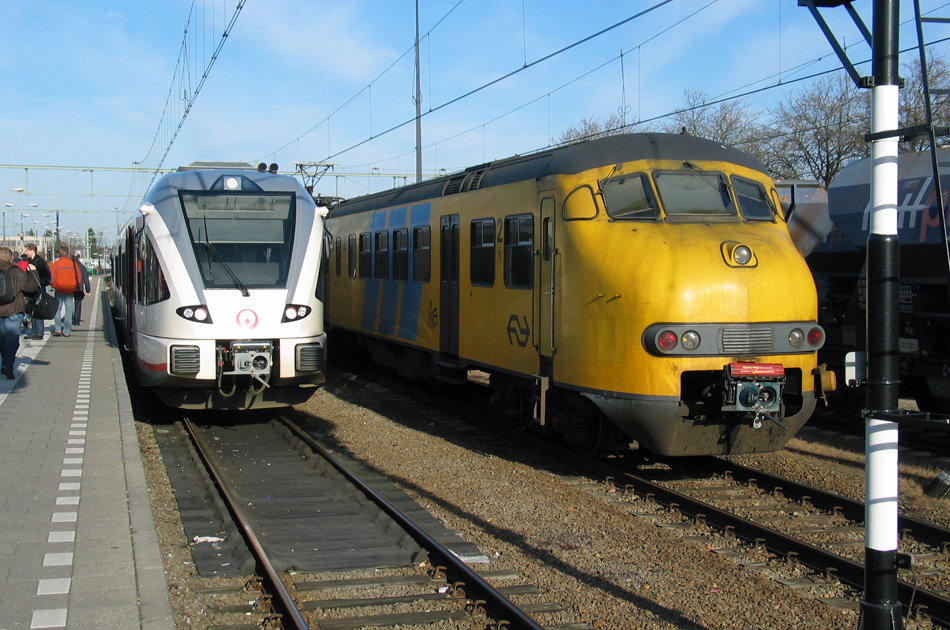 In 2006 nam de provincie Limburg het reizigersvervoer over. De concessie werd verleend aan Veolia en toen verschenen er andere treinstellen op de Maaslijn. Korte tijd waren dat van NS overgenomen Wadlopers (hier omgedoopt tot Maashoppers), daarna kwamen er GTW’s. Op 26 januari 2008 nam de NVBS met een excursie afscheid van de Wadlopers op de Maaslijn. Op de foto GTW 354 als excursietrein met rechts Plan V 483.
