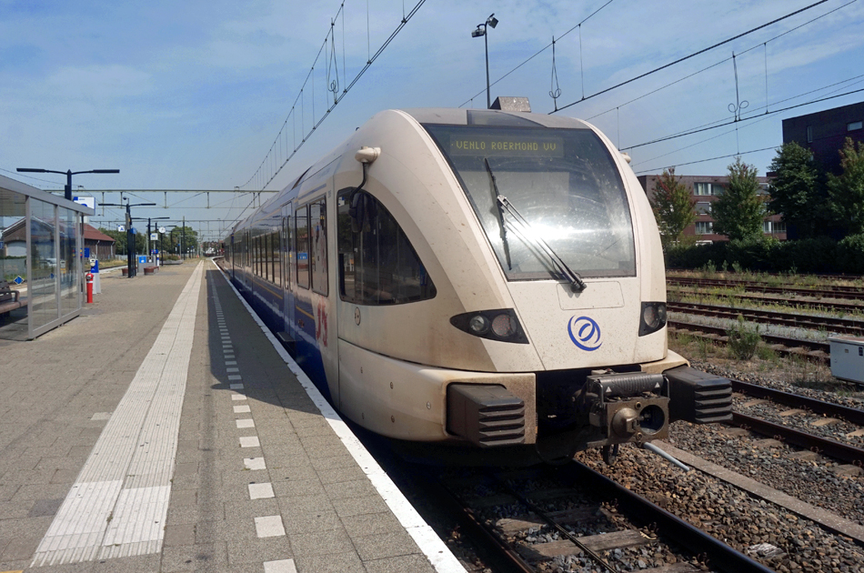 In 2016 nam Arriva de dienst hier over. De dieselelektrische GTW’s bleven rijden maar kregen natuurlijk wel de huisstijl van Arriva. GTW 385 staat op 14 augustus 2025 gereed voor vertrek naar Venlo. Arriva verzorgt ook de dienstregeling tussen Roermond en Maastricht. Dat gebeurt met elektrische GTW’s die verderop van hetzelfde perron vertrekken. In Roermond zijn ook nog steeds gele treinen te zien: de NS-intercity’s van Eindhoven naar Heerlen en Maastricht.