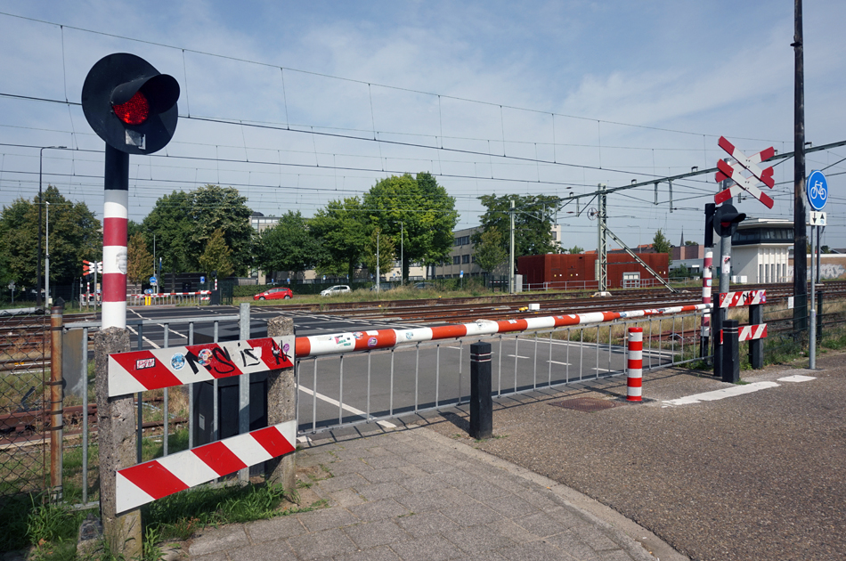Roermond beschikt over de allerlaatste overweg in Nederland die door een menselijke wachter wordt bediend. Tegenwoordig gebeurt dat vanuit de verkeersleidingspost in Maastricht; het seinhuis van Roermond is niet meer bemand. Deze zogeheten EBO (elektrisch bediende overweg) bevindt zich 500 meter ten noorden van het station. Auto’s kunnen er niet overheen. Foto gemaakt op 14 augustus 2025.