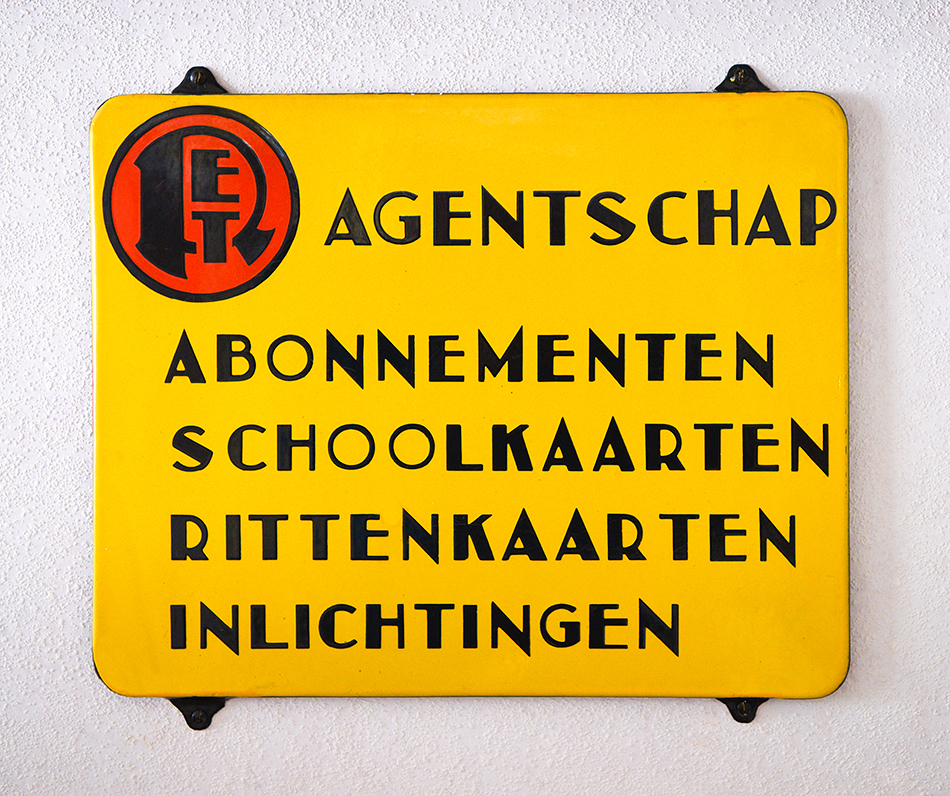 Toen het trambedrijf in Rotterdam door de gemeente werd overgenomen, zette de energieke nieuwe directeur Nieuwenhuis een nadrukkelijke vernieuwing in. Naast 190 nieuwe trams en ingrijpende modernisering van ouder materieel werd op een consequente manier een opvallende huisstijl ingevoerd. Onder invloed van kunstbeweging De Stijl werd gekozen voor het gebruik van primaire kleuren in combinatie met een Art Deco-letter. Dit bord voor een agentschap is er een voorbeeld van. Op mijn fietsroute naar de middelbare school lag zo’n bord in de etalage van een sigarenzaak. Ik keek er bijna iedere dag naar. Op een ochtend zag ik dat de winkelactiviteiten gestopt waren. Met de dwingende schoolbel in het vooruitzicht besloot ik naar de les te gaan en in de middagpauze naar de winkel terug te keren. ’s Middags kreeg ik te horen dat het bord die ochtend aan de vuilniswagen meegegeven was. Tientallen jaren later heb ik alsnog een identiek bord kunnen verwerven. Ik kijk er tot op de dag van vandaag graag naar.