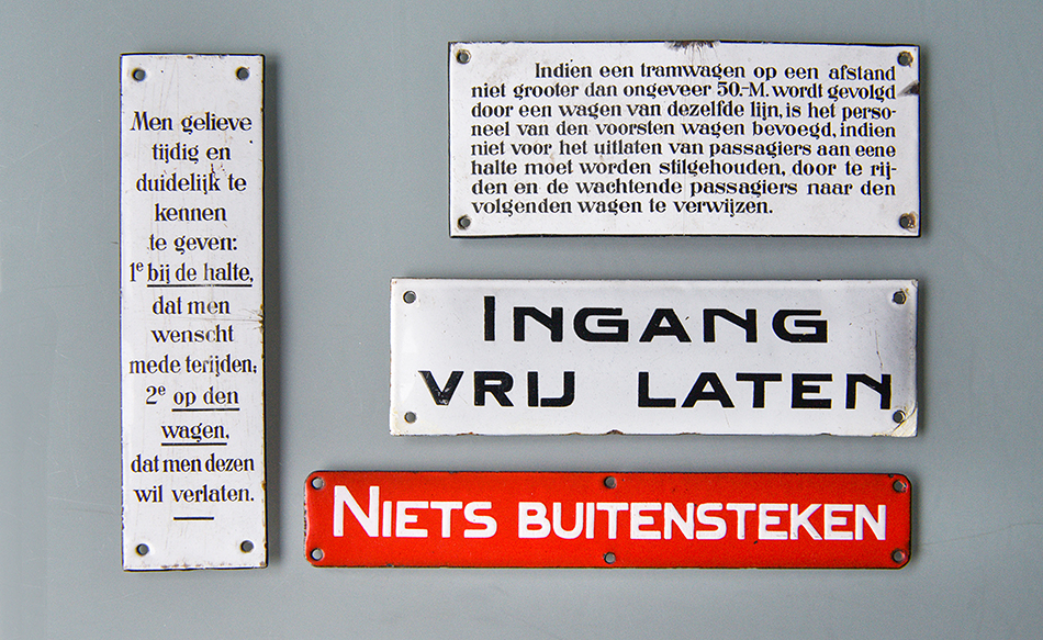 Trambedrijven brachten vanaf het begin opschriften aan in en op de rijtuigen, bij haltes, in wachthuisjes en in agentschappen. In de loop der jaren kwamen daar steeds meer voorschriften en verbodsbepalingen bij. Waren de teksten eerst vaak geschilderd, vanaf ongeveer 1910 deden geëmailleerde bordjes hun intrede. In de jaren dertig kwamen daar nieuwe materialen bij, zoals gegraveerd aluminium en resopalplaatjes: meerkleurige, gelamineerde kunststof waarin door graveren een contrasterende tekst zichtbaar werd.