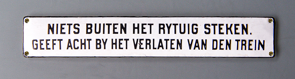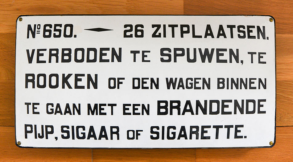Sommige tramrijtuigen bleven lang in gebruik terwijl de teksten nooit waren aangepast. Een aantal houten stoomtramrijtuigen van de RTM werd ruim zestig jaar gebruikt. Het afgebeelde bordje komt uit zo’n rijtuig.