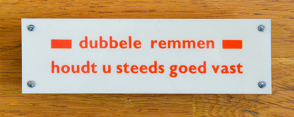 Vanaf juni 1957 kwamen in Amsterdam nieuwe enkelgelede trams in dienst: elegant vormgegeven en standaard voorzien van railremmen. De bordjes met de raadselachtige tekst dubbele remmen konden bij passagiers vragen oproepen. Naast de handrem en de elektrische generatorrem waren als noodremsysteem magnetische railremblokken aangebracht. Bij een noodremming worden die elektrisch bekrachtigd, waardoor ze magnetisch vastkleven aan de rails. Een tram kan op die manier abrupt tot stilstand gebracht worden. Industrieel ontwerper Friso Kramer adviseerde over de vormgeving van deze trams. In lijn met de grafische ontwerpprincipes van die tijd werden hoofdletters weggelaten en werd consequent het destijds moderne lettertype Gill Sans gebruikt.