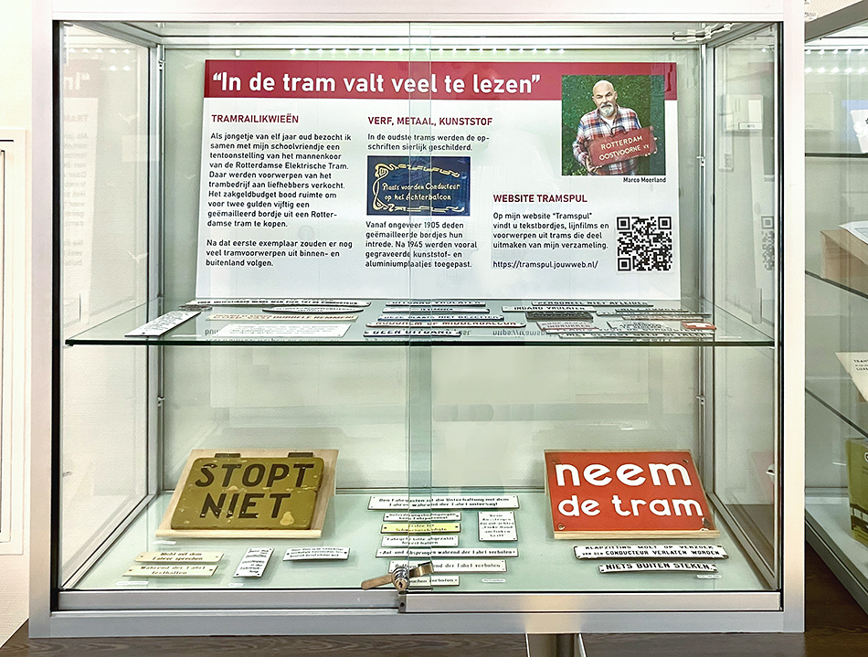 Marco Moerland verzamelt sinds zijn jeugd trambordjes en stelt er momenteel een aantal tentoon in NVBS Centraal. Ze geven informatie, tonen identiteit en weerspiegelen de tramgeschiedenis.