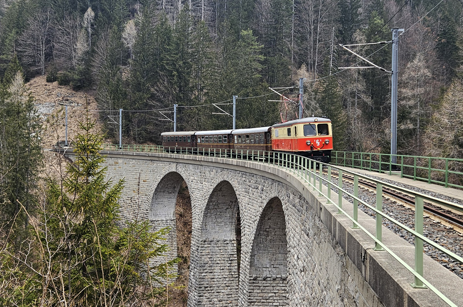 Fotostop van de excursietrein met elektrische stangenloc E11 en drie rijtuigen van de Mariazellerbahn op het Saugrabenviadukt tijdens de Winterreis 2025 van de SNE, 23 februari 2025. Foto: Paul Wiggenraad.