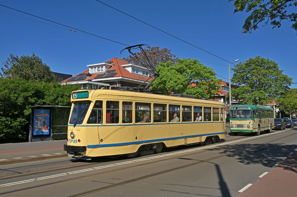De Brusselse PCC 7065 en bus 327 tijdens de fotorondrit van de SNE, Doctor van Welylaan, Den Haag, 10 mei 2025. Foto: Han Duijve.