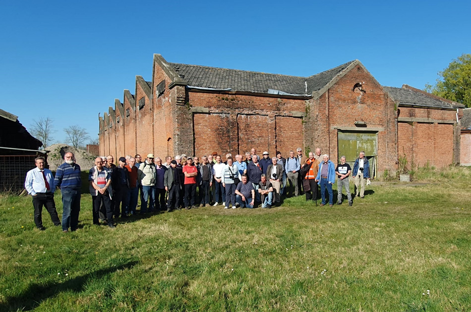 De deelnemers aan de excursie Sporen uit het Verleden 26 bij de oude remise annex werkplaats van de Stoomtramweg-maatschappij Breskens-Maldeghem in Draaibrug. Tweede van rechts rondleider Theo Buijsse, 5 april 2025. Foto: Geert Gorissen.