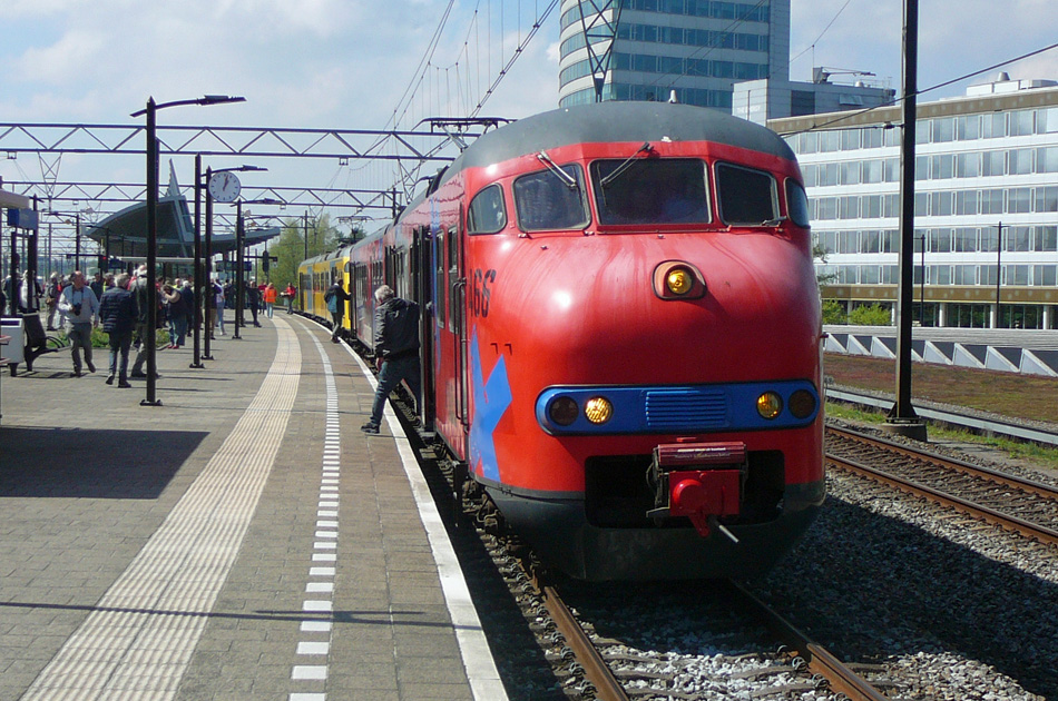 Deelnemers aan de Koningsdagrit van de SNE stappen voor een fotostop op station Hoofddorp uit De Karel, Plan V-treinstel 466 van de Karel Foundation, 26 april 2025. Foto: Frank Hoogenboom.