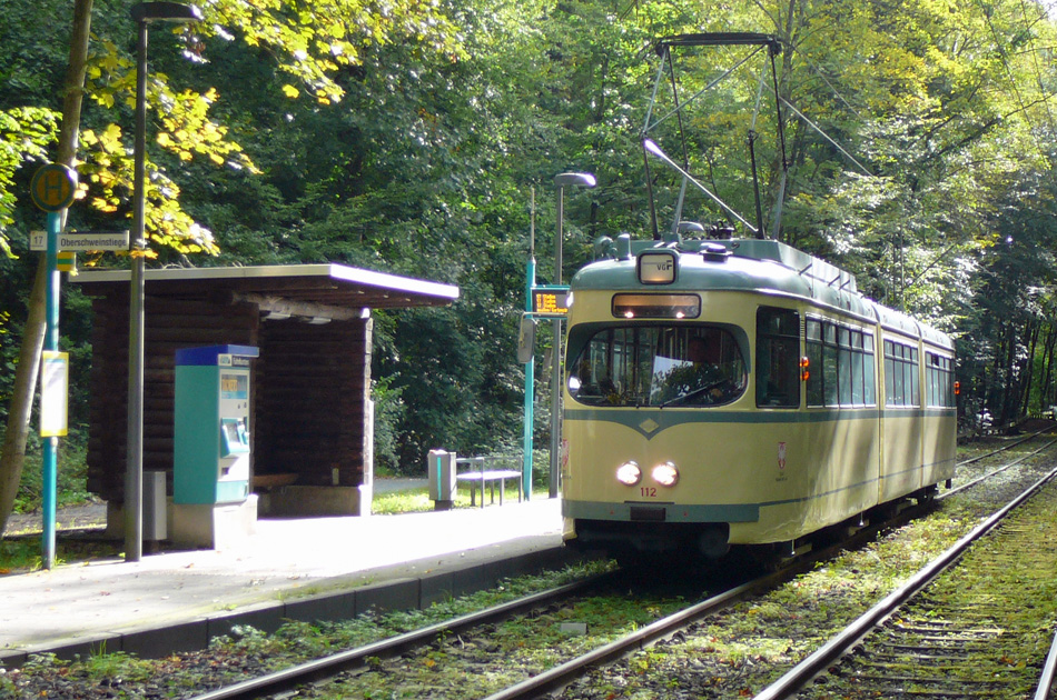 Museumtram Düwag N 112 bij de halte Oberschweinstiege in Frankfurt tijdens het Maxi-weekend Mainhattan van de SNE, 5 oktober 2025. Foto: Frank Hoogenboom.