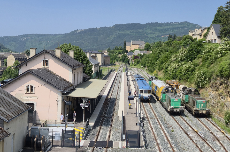 Zicht op station Mende met links de museumstellen X2800 en rechts twee werktreinen tijdens de Voorjaarsreis van de SNE, 9 juni 2025. Foto: Thijs Bennis.
