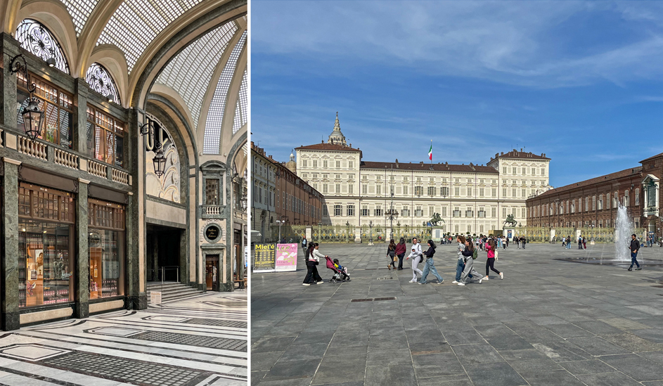 De Galleria San Federico (links) en het Piazza Castello (rechts).