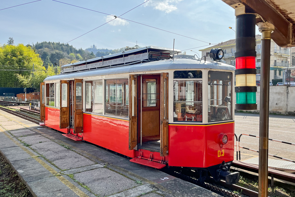 Rijtuig D.3 van de Tandradlijn Sassi–Superga in het benedenstation Sassi.