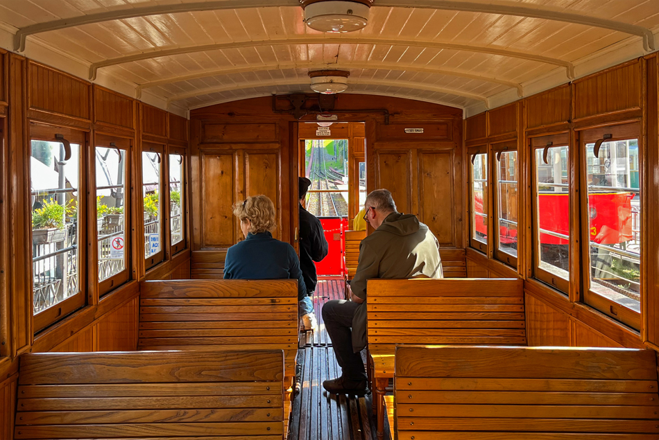 Het interieur van een rijtuig van de tandradlijn Sassi–Superga.