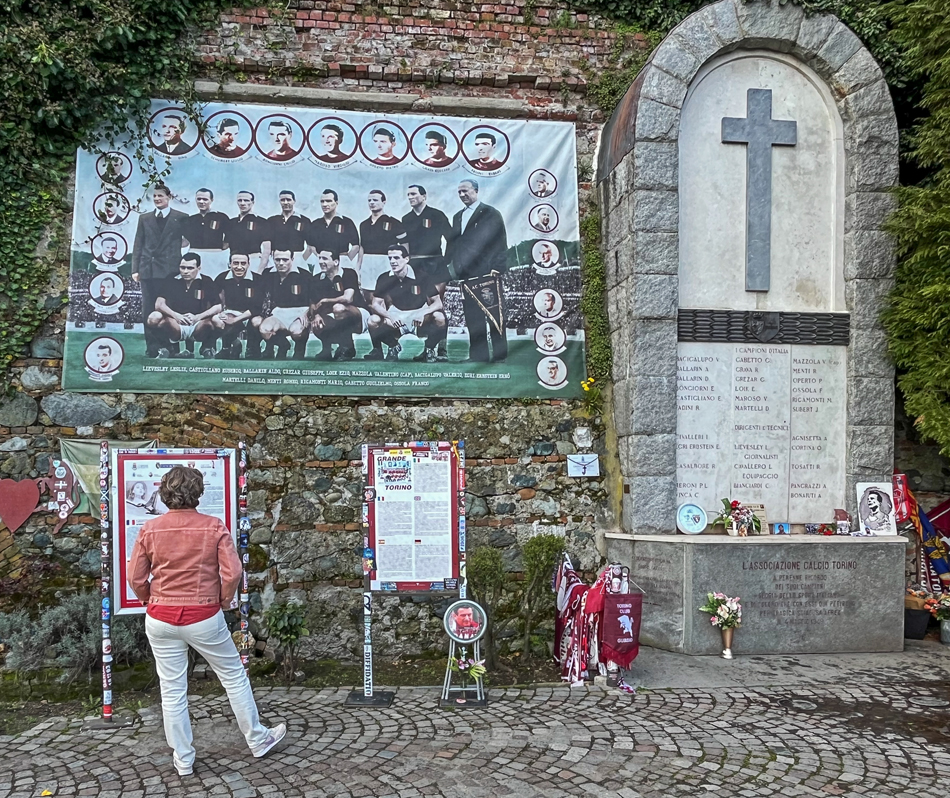 Aan de achterkant van de basiliek is een indrukwekkend herdenkingsmonument voor de tragedie met het elftal van Juventus. Ondanks dat deze gebeurtenis al meer dan 75 jaar geleden plaatsvond, is de plek zeer druk bezocht. Wellicht speelt een rol dat Juventus de populairste voetbalclub van Italië is, maar niet in Turijn zelf. In de jaren veertig won “Il Grande Torino” vijfmaal de Serie A (de Italiaanse hoogste voetbaldivisie). Aan die zegenreeks kwam een abrupt einde toen in een noodlottig vliegtuigongeluk op 4 mei 1949 het hele elftal de dood vond op de Superga.