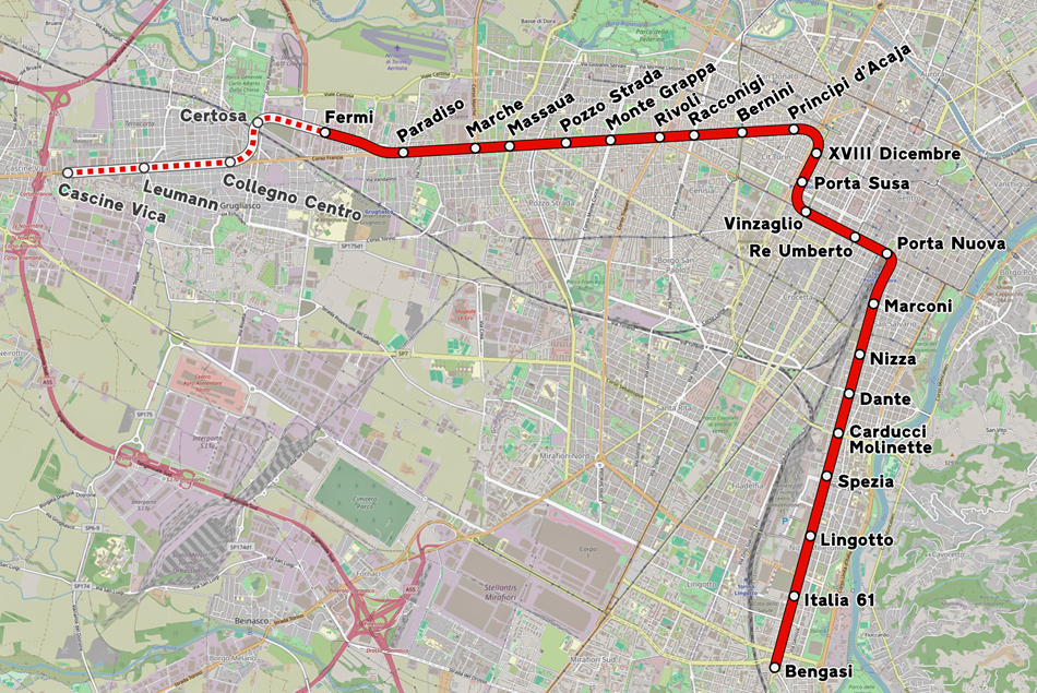 Een van de metrostations, twee haltes van het zuidelijke eindpunt Benghasi, is Lingotto, op loopafstand van het voornoemde automuseum. In deze wijk bevindt zich een oude Fiat-fabriek (inderdaad: Lingotto genaamd) waar al lang geen auto meer van de band rolt. Het complex is volledig geherstructureerd onder leiding van de wereldberoemde architect Renzo Piano, tot een “multi-purpose-building”. Het biedt nu plaats aan onder meer een congrescentrum, een concerthal en een winkelcentrum. Op het dak is met Google Maps nog steeds de langwerpige, ovale testbaan voor auto’s te zien, inmiddels omgetoverd tot een hangende tuin.