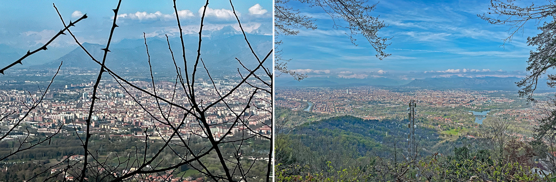 Ben je gearriveerd op de top en is het helder weer, dan is het mogelijk om vanuit diverse uitkijkpunten Turijn aan de Po te zien liggen. Omdat de blik op het westen is gericht, zijn aan de horizon de besneeuwde toppen van de Alpen te zien.