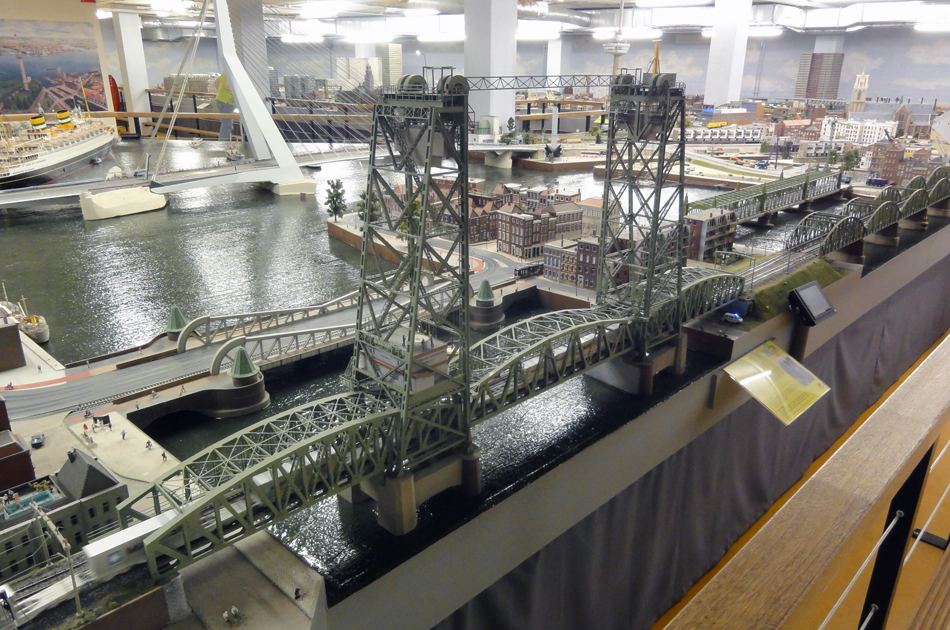“De Hef” en een aantal andere Rotterdamse bruggen. In de achtergrond is de Euromast te zien. Die past nog net onder het plafond van Miniworld.