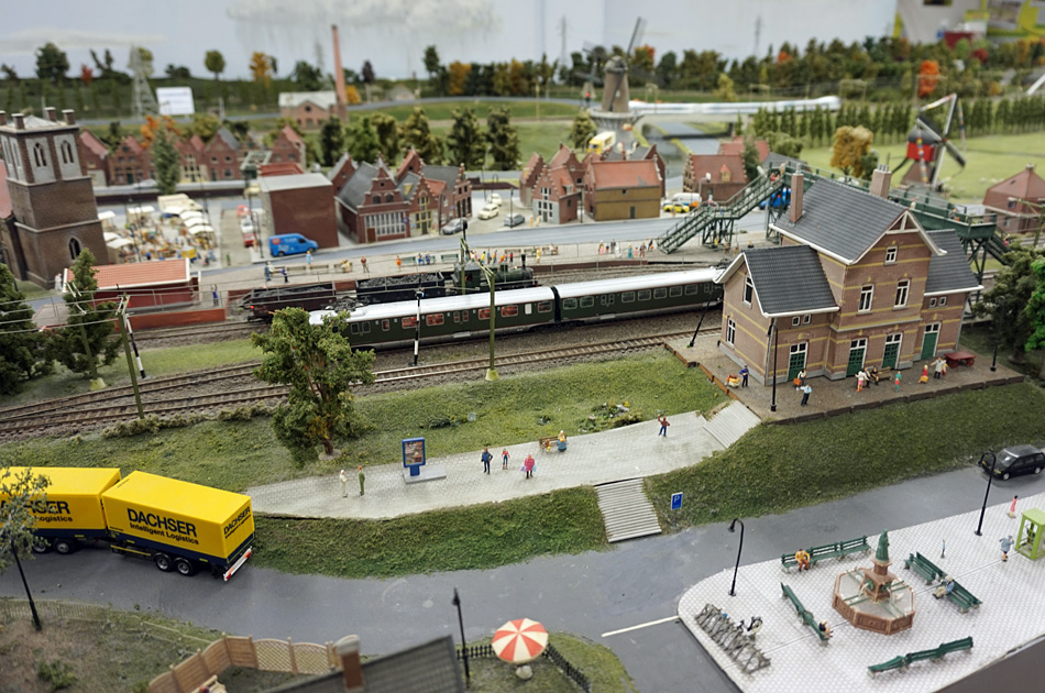 Meer kleine wereldenEr zijn meer kleine werelden waar treinen rondrijden. Misschien het bekendste is Madurodam in Den Haag. Lees meer over het spoorbedrijf van Madurodam. In Brussel is een soortgelijk park te bezoeken: Mini-Europe, naast het Atomium. Lees Brussel in één dag. Winterswijk bezat vroeger een enorm spoorwegemplacement, met twee stations, drie locdepots en een groot rangeerterrein. Het emplacement anno 1928 is nagebouwd te zien bij Transit Oost naast het station van Winterswijk. Van het station en het grote emplacement van Roosendaal heeft de Modelspoorvereniging Post B een grote maquette gebouwd naar de situatie anno 1930. Raadpleeg de website van de vereniging wanneer en waar de maquette te zien is. In Duitsland is Miniaturwunderland Hamburg een begrip. Net zoiets als Miniworld Rotterdam, maar dan vijf keer zo groot. In Leer, vlakbij de grens met Groningen, bevindt zich het Leerander Miniaturland. Hier is ook de grote modelbaan Loxx Miniatur Welten Berlin naartoe verhuisd. Wie per trein door Duitsland reist, kan op grote stations een vitrine tegenkomen waarin je tegen betaling treinen kunt laten rondrijden. Lees meer over de Modellbahn im Bahnhof. |