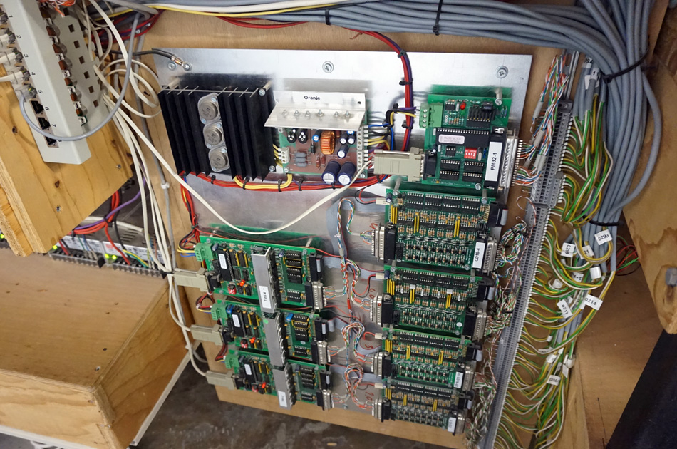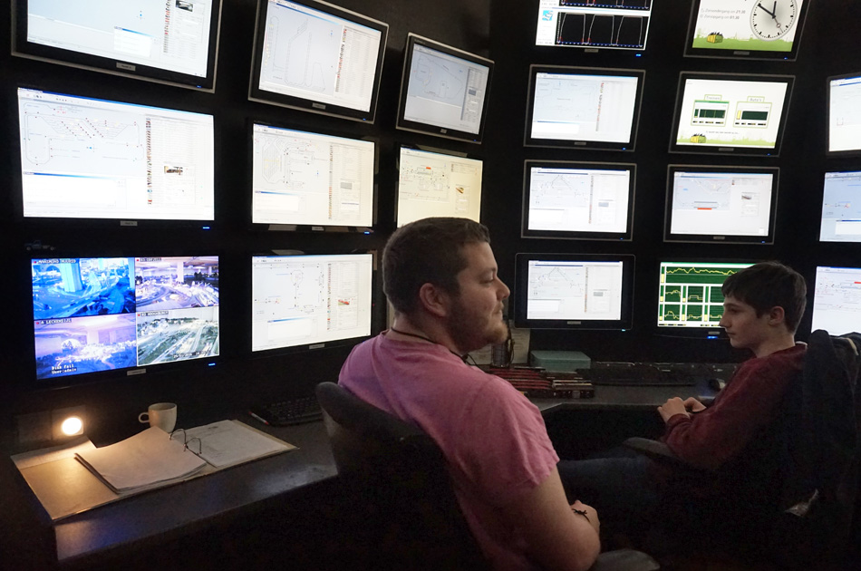 Kijkje in het controlecentrum. Rechtsboven de klok die de miniatuurtijd aangeeft (1 minuut = 1 uur).