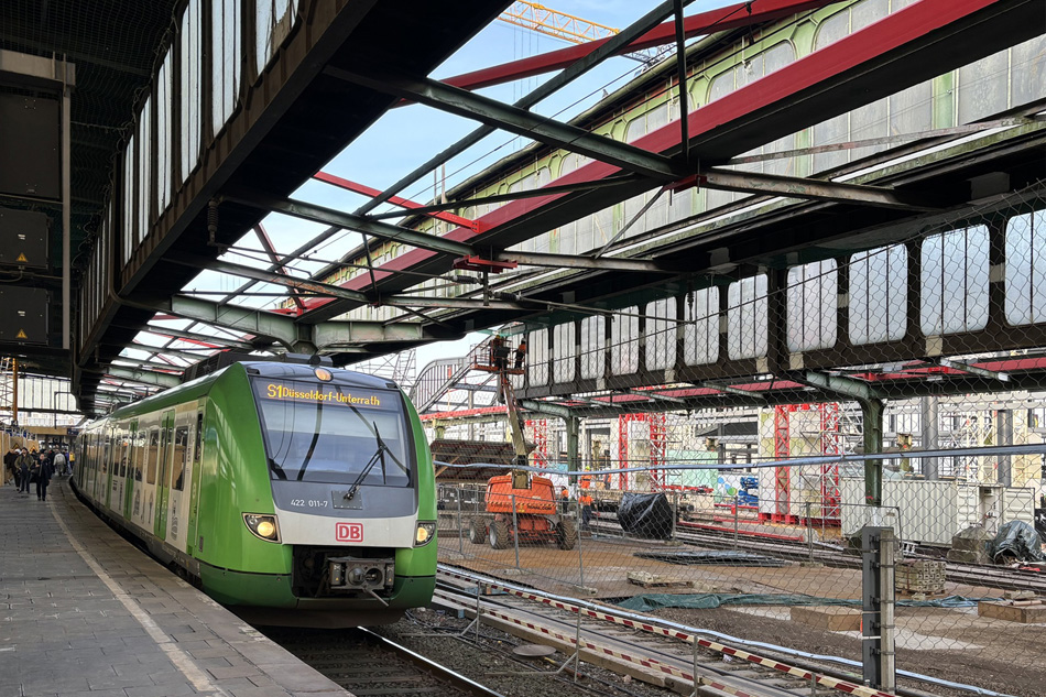 De nieuwe kapconstructie is aanzienlijk hoger dan de oude overkapping. Tussen al het treinverkeer en reizigersbewegingen door draaien verschillende hoge bouwkranen over het station. Werktreinen zorgen voor de af- en aanvoer van materialen. Toch ontkomt men niet aan grotere beperkingen in het treinverkeer. Bijvoorbeeld was in januari de stop in Duisburg voor sommige ICE’s vervallen. En zo reed ik zonder te stoppen in ICE 225 Amsterdam – München over het doorrijdspoor 400 tussen het stationsgebouw en de reizigersperrons in Duisburg Hbf.