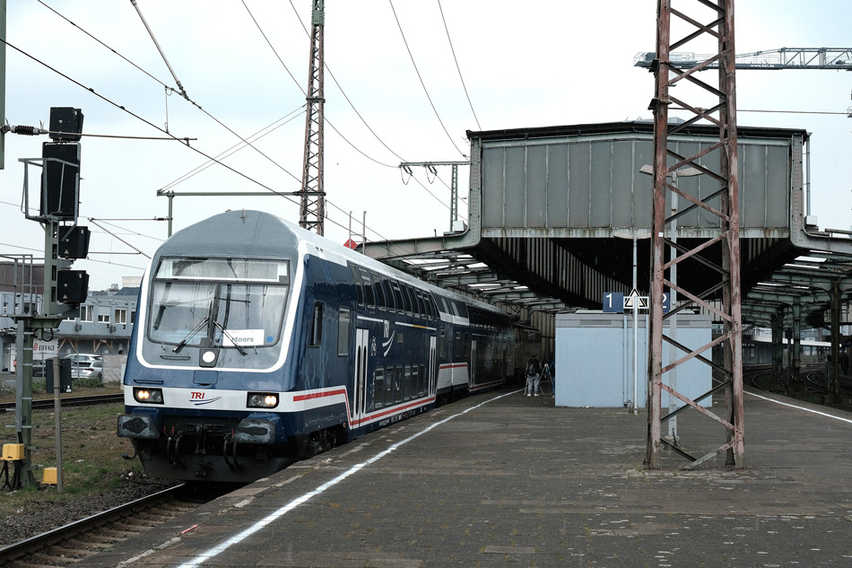 Spoor 1-2 met oude kap; dubbeldekker van TRI naar Moers. 24 maart 2025.
