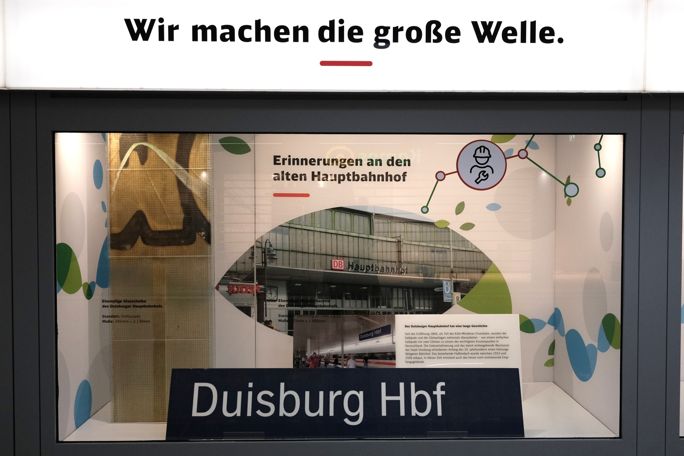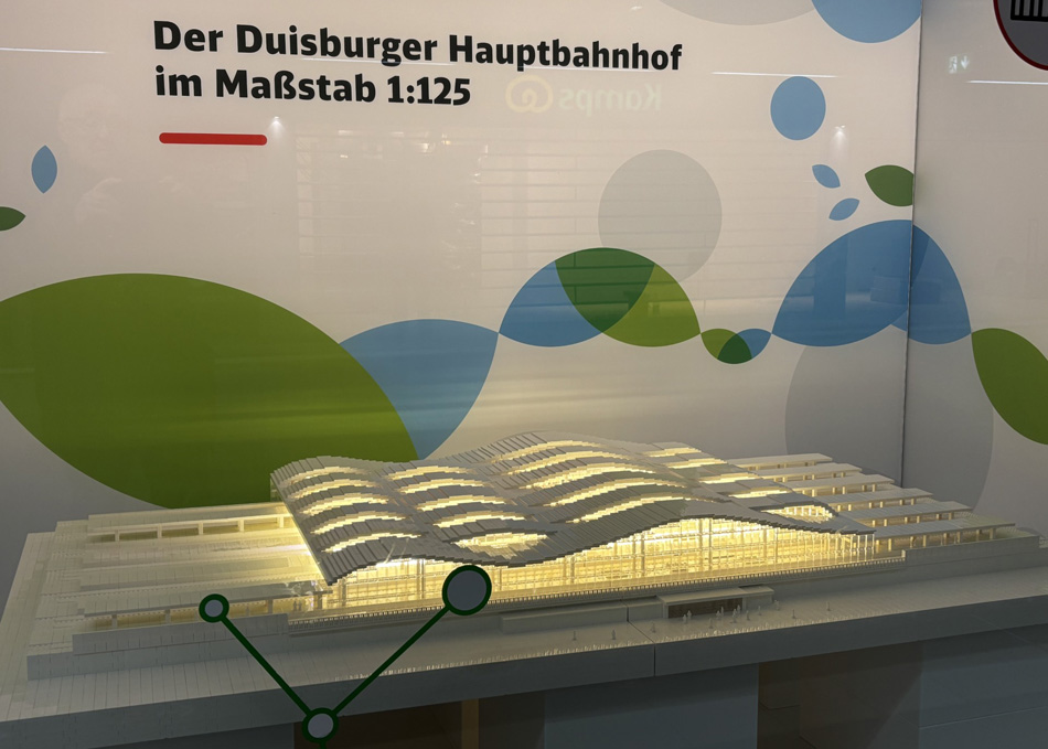 In de stationstunnel zijn informatievitrines ingericht over de verbouwing. Foto hieronder: in 2028 zal Duisburg Hbf er zo uitzien.