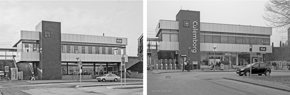 Het station Culemborg in november 1975 en op 8 februari 2026.