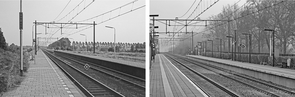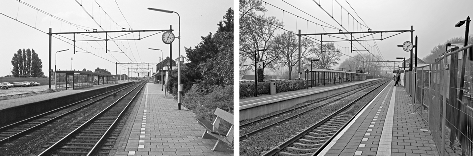 Het perron richting Utrecht in augustus 1975 en op 8 februari 2026. De hekken aan de rechterzijde hebben te maken met de verbreding van het perron van spoor 1.