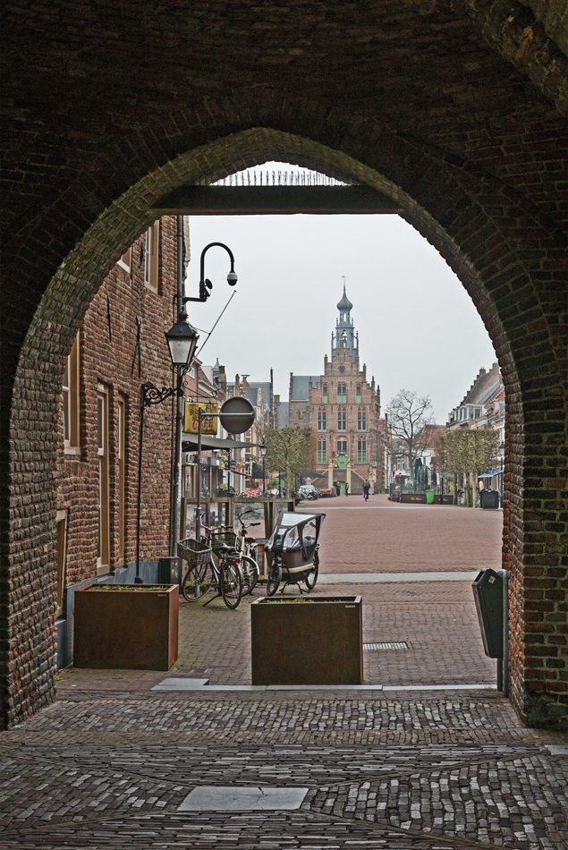 De Markt in Culemborg vanuit de Binnenpoort met op de achtergrond het stadhuis op een koude en mistige 8 februari 2026.